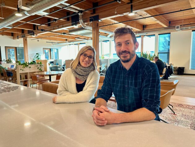 The Pioneer Collective co-founders Audrey and Christopher Hoyt inside their Ballard co-working space. Other locations are in Belltown and Tacoma. (GeekWire Photo / Kurt Schlosser)